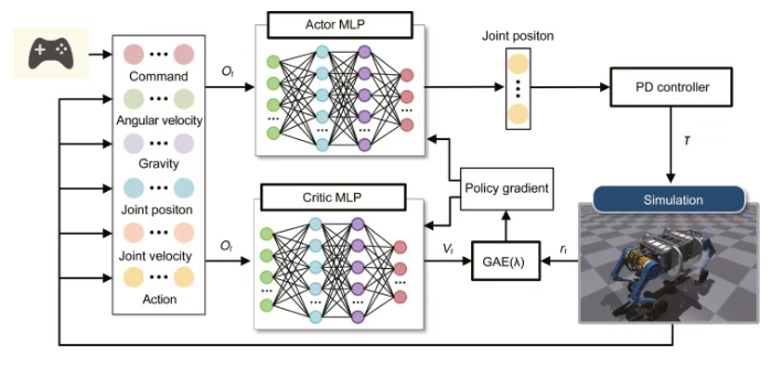 在运动控制方面,机器人采用了结合近端策略优化 (PPO) 和低级 PD 控制器的混合控制系统。该策略在模拟中训练,观测数据包括命令输入、关节位置和速度、角速度、重力矢量和先前的动作。执行器网络输出关节位置目标,PD 控制器跟踪这些目标以产生扭矩命令。使用该框架,机器人实现了超过 12 km/h 的非铺砌地形运动速度,展示了其在具有挑战性的高地环境中的多模态移动性和系统稳健性。