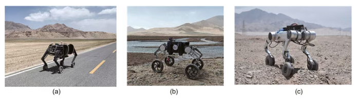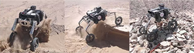 想象一下,在平坦的戈壁或草原上,它用车轮移动,速度能达到 12 公里/小时,还能拉着几十公斤的物资;遇到半米高的沟渠、松动的碎石坡,或者陷人的湿地时,它会立刻切换模式,车轮收起,四条 “腿”撑住地面跨障碍、爬陡坡,甚至能在烂泥里调整重心,不被陷住。