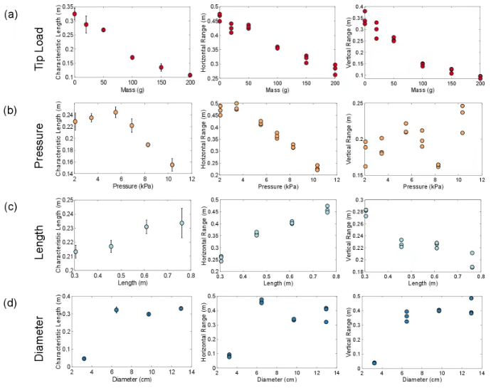机身长度实验表明,在0.30米至0.76米范围内,更长的机身能够扩大特征长度与水平移动范围,这是由于相同曲率下末端位移随长度增加而增大。然而,垂直移动范围随长度增加而减小,反映出更长机身对抗重力的能力下降。研究人员指出,需在灵活性与结构稳定性之间取得平衡,过度延长可能导致机身坍塌,使操纵性能急剧恶化。