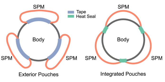 实验所用机器人主腔直径统一为7.6cm,长度1.75m,放置于地面以消除重力影响。两种执行器在设计上具有明显差别:外部袋式执行器先单独制作三个串联袋式电机,再用胶带固定在主腔外侧;集成式执行器则将主腔与执行器作为双层结构一体制作,通过热封折叠织物同时形成主腔壁和内部袋式腔室。