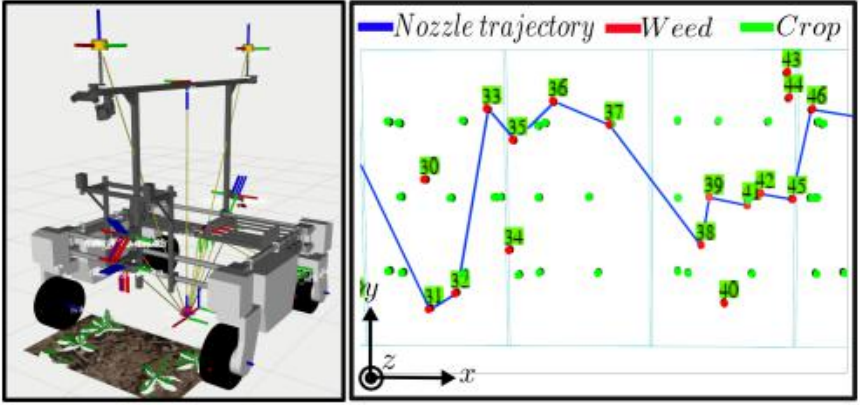 基于ros的仿真模型的演示(图左),其中所有传感器和执行器都处于激活状态。田间生成器允许团队创建具有不同植物大小和作物形状的行作物田,模拟一个真实的田间。为了评估除草算法,团队还开发了一个基于Python的原生框架,它能够模拟机器人的运动学,并生成具有不同杂草分布的合成作物行。这个框架使用Open3D和Pyglet python库来渲染图形,图中显示了一个简化的规划场景示例视图(图右)。团队使用这个环境来实现和评估不同的除草策略。