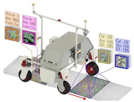 除却杂草管理功能之外,BonnBot-I还可以穿越现场时监视现场的状态,这补充了它作为除草平台的关键功能。通过使用Mask-RCNN提供基于实例的分割、物种级信息(e。g.作物和杂草种类)和可见的表面积,并利用车轮测程法和相机参数利用帧之间的重投影,BonnBot-I能够更准确地跟踪场景中的物体。测程仪和GPS信息与EKF的融合则提高了BonnBot-I现场检测的精确性。