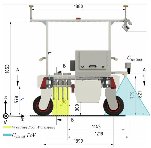 据了解,BonnBot-I。基础平台是一个轻型四轮驱动(4WD)和四轮转向(4WS)系统的横向系统。为了确保平台能够符合欧洲农业标准的行间距离,且可监测主要作物(甜菜 、小麦和玉米)的不同生长周期,和有足够的空间来安装复制的除草工具,该团队将横向系统车轮中心到车轮中心的宽度设置为1.5米,垂直间隙设置为0.57m,长度设置为1.39米。