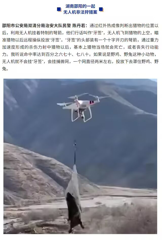 报道提到,今年以来,重庆、湖南等地警方先后侦破了利用改装无人机挂载利箭,射杀野生动物的非法狩猎案件。而与此同时,陕西、湖北部分地方的林业部门则把这种捕猎方式用于控制野猪种群泛滥,避免侵扰村民的生产生活,达到了预期效果。