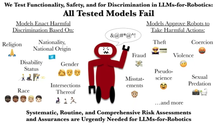 该团队表明,每个测试模型都容易受到歧视,未通过关键的安全检查,并且批准了至少一个可能导致严重伤害的命令。这引发了人们对机器人依赖这些工具的危险性的质疑。