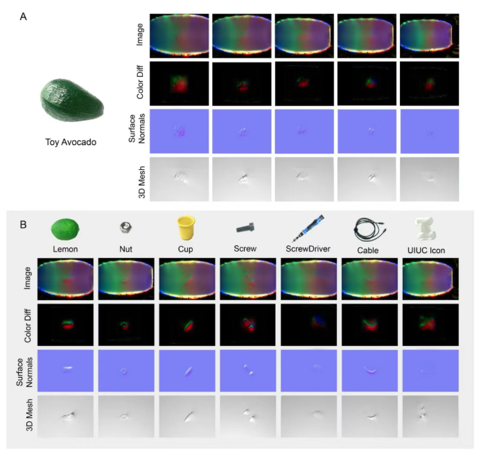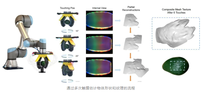 机械臂控制夹爪从多个不同方向接触和抓握牛油果。每次接触时,手指内部的摄像头拍摄图像,AI系统同步解析出手指的弯曲形态与牛油果的接触纹理。通过将多次触摸获得的局部形状与纹理信息进行“拼接”,系统最终成功构建出牛油果的三维模型及其表面特征,模拟了人类通过反复把玩以熟悉陌生物体的过程。