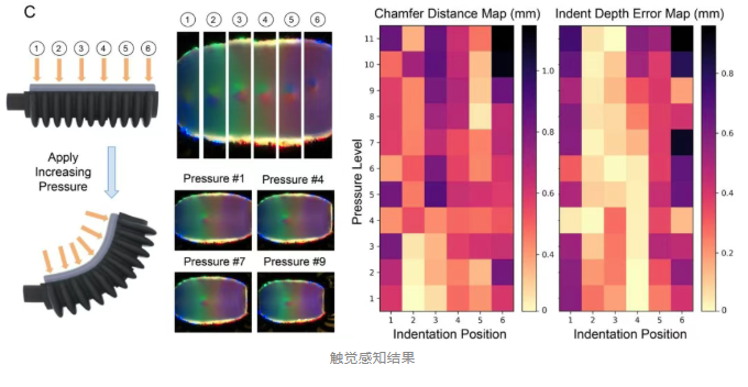 为量化触觉性能,团队引入倒角距离与最大压痕深度误差两项指标,在多个压痕位置与压力水平下进行测试。结果显示,在传感器中心区域、中低压力条件下重建精度最高,倒角距离可达0.18毫米,深度误差低于0.2毫米。边界区域或高压条件下性能略有下降,但整体重建结果仍保持可靠。