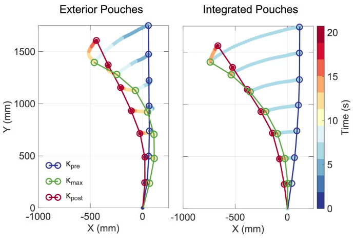 执行器的制作方式选择应基于任务所需的压力比范围。外部袋式执行器在低压力比条件下具有优势,适合那些需要维持较高主腔压力以支持生长或抗坍塌的应用场景。集成式执行器虽然需要更高的压力比才能启动,但在支撑良好的环境中能够实现更大的最终曲率,适合对转向精度要求较高的平面任务。