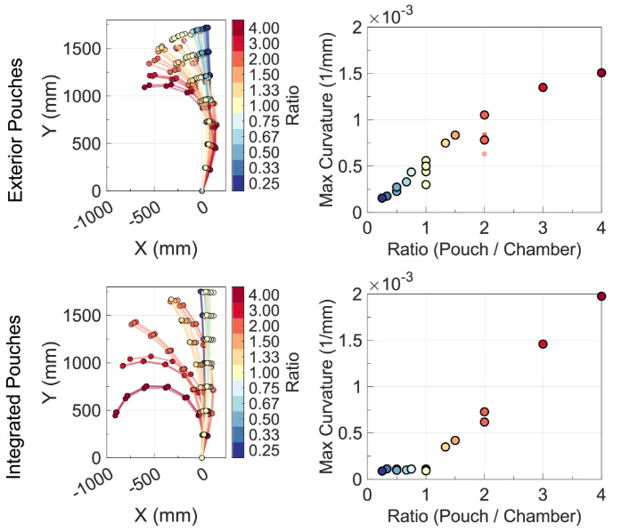 两种执行器在设计特性上表现出明显区别。外部袋式执行器具有低压力比启动的优势在压力比小于1时即可开始弯曲。然而随着压力比继续升高,其曲率增长逐渐放缓并趋于饱和,难以实现较高曲率。集成式执行器则需要压力比超过1才能开始弯曲,但一旦启动,曲率随压力比升高呈现近似线性增长,最终能够达到远高于外部袋式执行器的最大曲率。