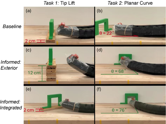 机身长度实验表明,在0.30米至0.76米范围内,更长的机身能够扩大特征长度与水平移动范围,这是由于相同曲率下末端位移随长度增加而增大。然而,垂直移动范围随长度增加而减小,反映出更长机身对抗重力的能力下降。研究人员指出,需在灵活性与结构稳定性之间取得平衡,过度延长可能导致机身坍塌,使操纵性能急剧恶化。