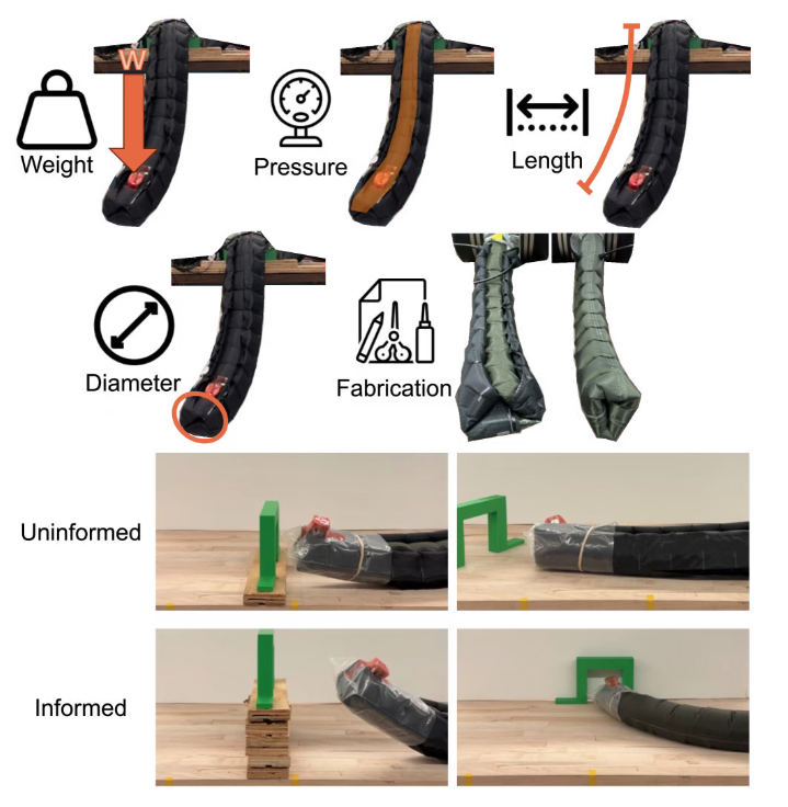 以建立“设计-控制-操纵性”的定量关系为核心目标,研究团队在进行实验时,一方面明确在无支撑的三维空间中,顶端负载、腔压、长度、直径如何影响机器人的曲率控制;另一方面探究地面支撑场景下,执行器制作方式(外部附着与集成式)及压力比对平面曲率的作用规律。最终,通过实验结果提炼设计与控制准则,让藤蔓机器人摆脱“临时参数”依赖,实现可推广的操纵性能优化。