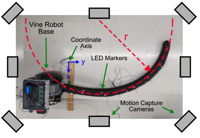 实验采用的藤蔓机器人主体由30旦尼尔可热封TPU涂层防撕裂尼龙织物制成,包括一个主腔室和三个沿圆周分布、沿长度方向附着的外部袋式执行器。机器人被水平固定于桌面边缘,形成悬臂结构,使其末端在自由空间中运动。通过闭环压力调节器精确控制主腔室与执行器内部气压,并利用运动捕捉系统实时追踪末端标记点的三维轨迹。所有数据均以机器人底座为坐标原点进行对齐,以准确反映其在实际空间中的运动状态。