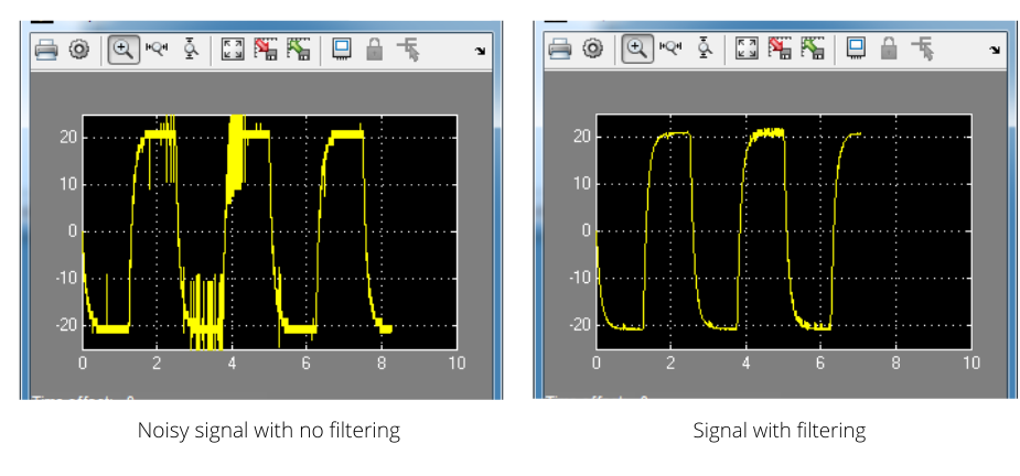 滤波在许多不同的行业中被广泛使用,经常在处理具有噪声并用于反馈控制的模拟传感器时使用。以QUBE-Servo 2过滤实验室为例,我们展示了从基于编码器的位置测量得出速度时如何需要过滤。下图将未经过滤的信号与经过过滤的版本进行了比较。您想在控制系统中使用哪一个?