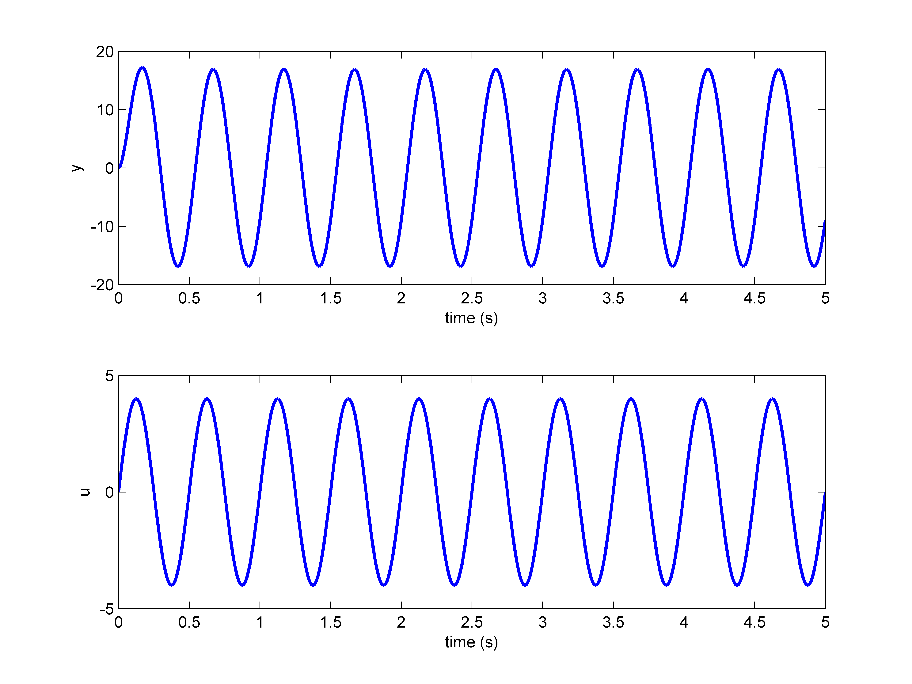 频率响应是一种已使用多年的经典方法。在这种情况下,将频率可变的正弦波应用于系统。然后使用相应的正弦输出响应来构建波特图。由此,可以识别传递函数模型参数。下图显示了施加输入电压信号u并测量输出电动机速度响应y时的示例响应。